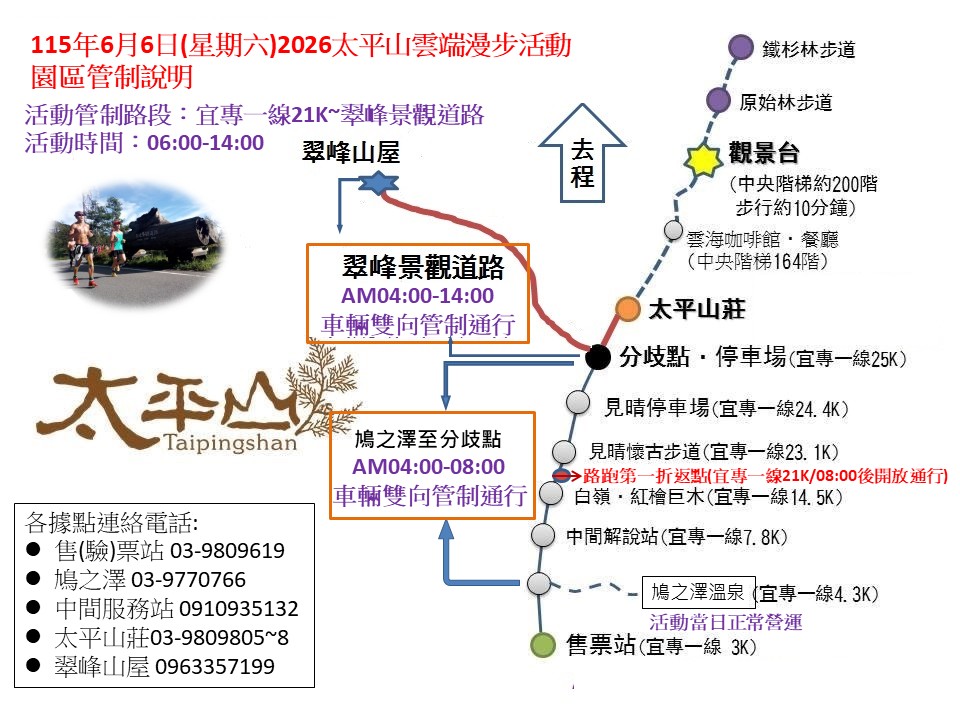 「2026太平山雲端漫步活動」定於6月6日(星期六)由宜蘭縣鐵人三項協會辦理,當日區內實施管制措施: